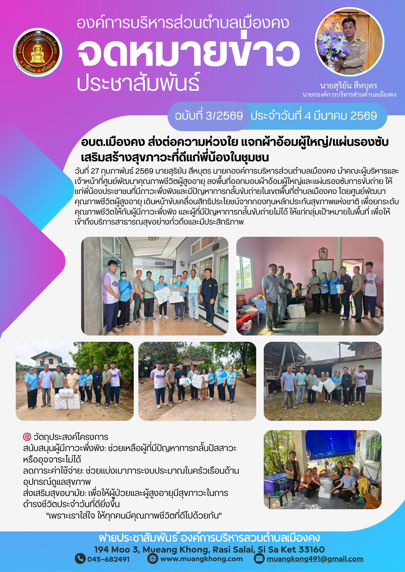 จดหมายข่าว อบต.เมืองคง ส่งต่อความห่วงใย แจกผ้าอ้อมผู้ใหญ่/แผ่นรองซับเสริมสร้างสุขภาวะที่ดีแก่พี่น้องในชุมชน