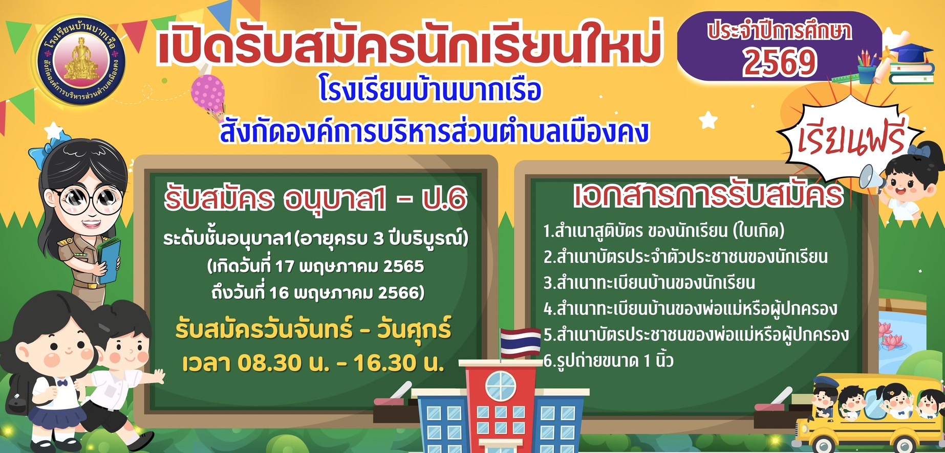 เปิดรับสมัครนักเรียนใหม่โรงเรียนบ้านบากเรือ สังกัดองค์การบริหารส่วนตำบลเมืองคง ประจำปีการศึกษา 2569 รับสมัครระดับชั้นอนุบาล 1 - ชั้นประถมศึกษาปีที่ 6 ระดับชั้นอนุบาล1 (อายุครบ 3 ปีบริบูรณ์) รับสมัครวันจันทร์ - วันศุกร์ เวลา 08.30 น. - 16.30 น.